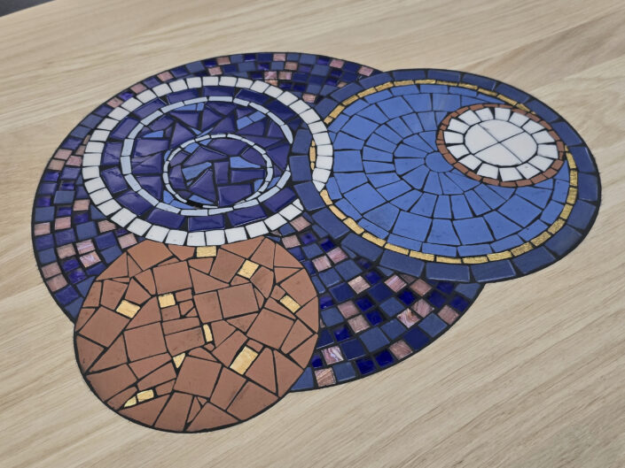 Elle s’accorde avec les couleurs du quilt suspendu et du mobilier. Le joint noir majoritairement utilisé vient souligner les couleurs et mettre en avant les cercles de la mosaïque. Il s’harmonise avec le style vitrail de la tapisserie.