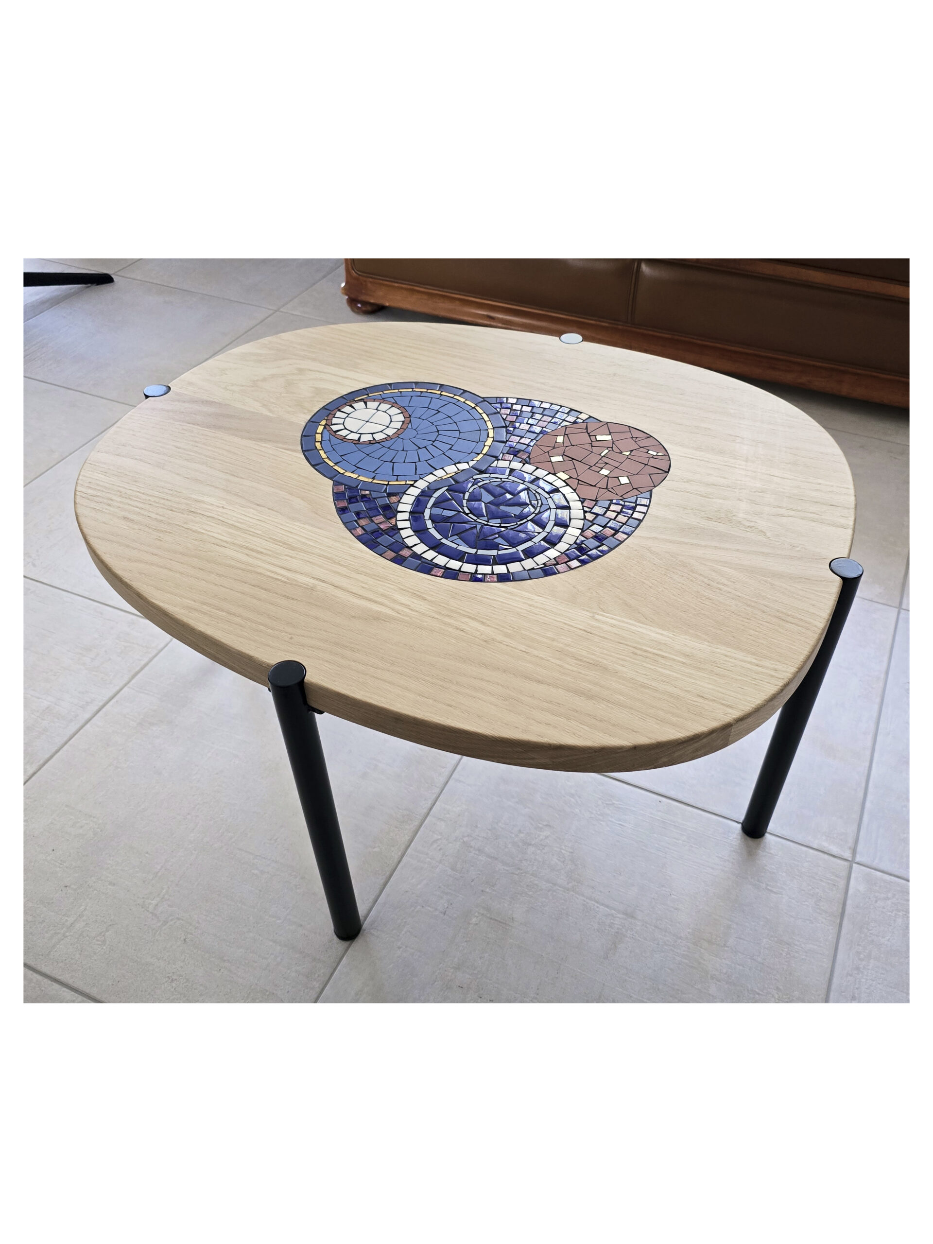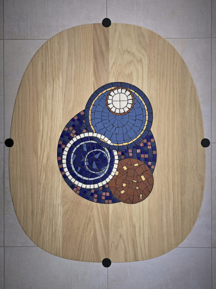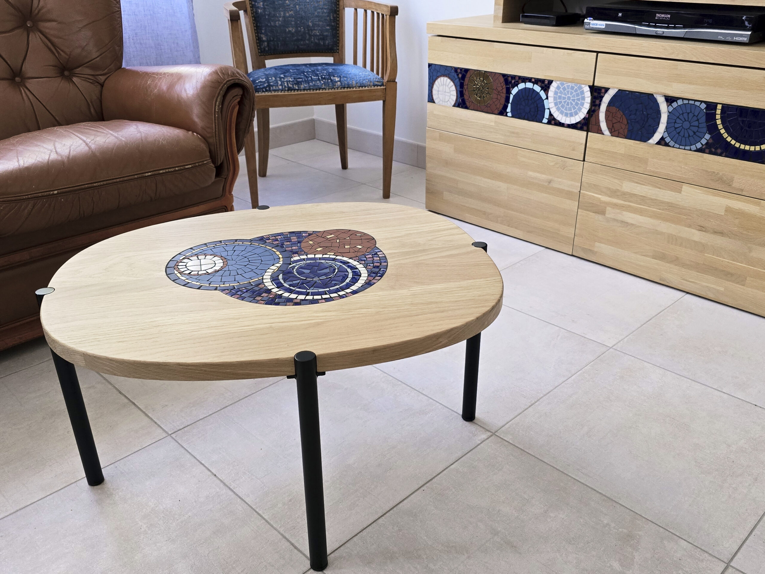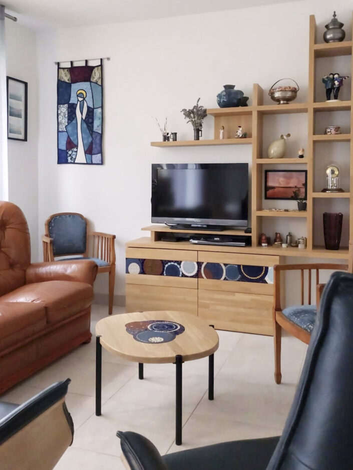 Côté table : Agnès a eu un crush pour la table Arno ! Je l’ai donc adaptée aux couleurs de son salon. La table s’harmonise au meuble sur mesure : j’ai utilisé du chêne et repris les couleurs de la mosaïque présente sur le meuble.